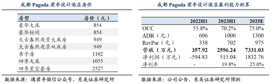 經典案例:根據遇君亭微信公眾號、公司公告、東吳證券研究所等綜合資訊表明,成都 Pagoda 開業以來獨特的設計風格吸引大量顧客打卡,小紅書上成都 Pagoda 酒店 tag 熱度達 17 萬次瀏覽。2023 年 H1,成都 Pagoda 實 現營業收入 2596.24 萬元,RevPAR 為 702 元,同比+108%。
