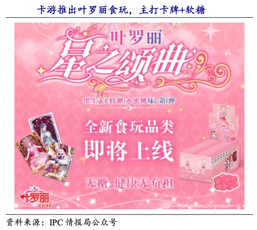 經典案例:根據IPC情報局公眾號、開源證券研究所等綜合資訊表明,卡游在2024 年 7 月卡游向經銷商發布了一則關于“將推出食玩類產品” 的公告,以提醒尚未有食品銷售資質的經銷商增加相關類目,從而更好地推進商品銷售。首款食玩類產品“葉羅麗·星之頌曲·維生素 C 軟糖 (水蜜桃味)-第一彈”已上線。