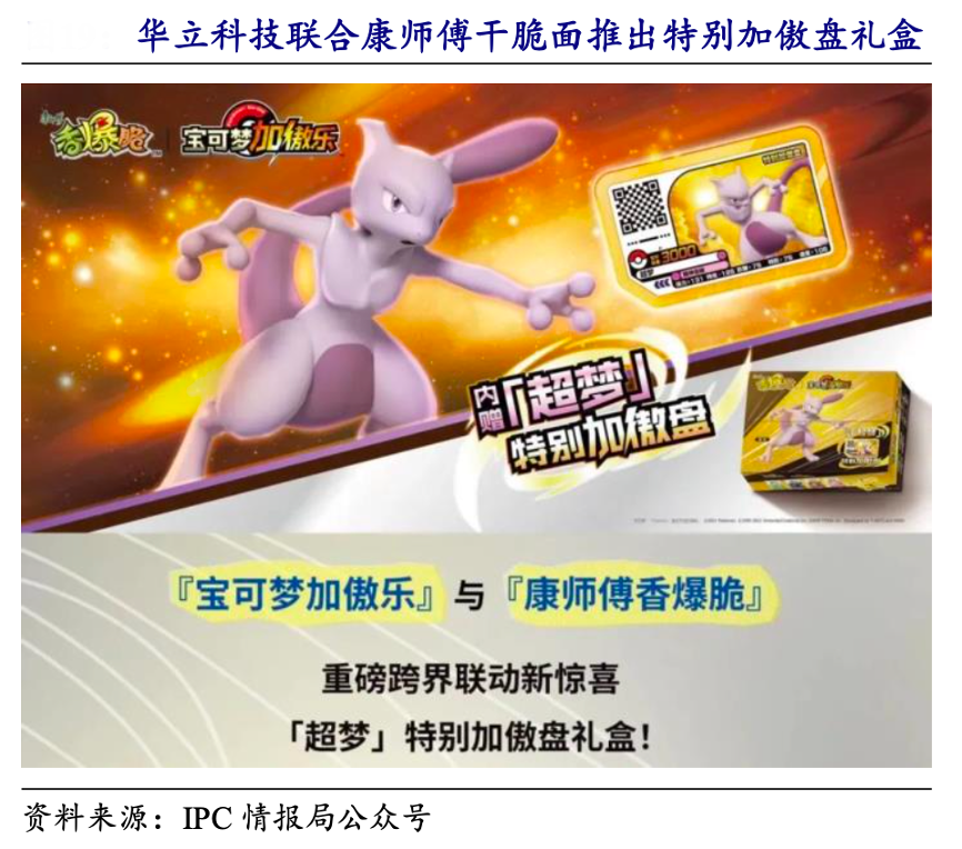 經典案例:根據IPC情報局公眾號、開源證券研究所等綜合資訊表明,華立科技聯合康師傅干脆面推出特別加傲盤禮盒,包含香爆脆干脆面與一張特別加傲盤,加傲盤可用于在對應游藝機進行游玩或收藏。