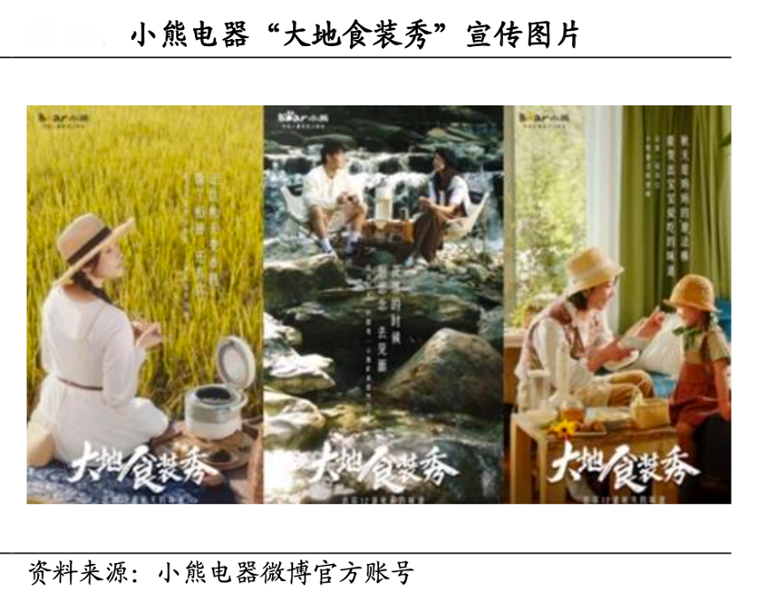 經典案例:根據小熊電器微博官方帳號、國海證券研究部等綜合資訊表明,2022 年 5 月小熊電器將品牌戰略定位為“年輕人喜歡的小家電”,其 11 月發布的“大地食裝秀”系列視頻,構建了戶外的沉浸式場景,在稻香中用電飯煲煮飯、在玫瑰園里用養生壺煮玫瑰花茶等畫面迎合了當代年輕人對小家電的儀式感、促進精致生活的要求,傳達了品牌“精致”的生活理念。