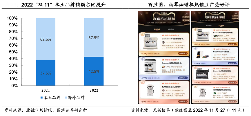 經典案例:根據魔鏡市場情報、天貓榜單、國海證券研究所等綜合資訊表明,從我國咖啡機銷售表現來看,德龍、奈斯派索、飛利浦等中高端海外品牌占據市場主流,百勝圖、柏翠等高性價比的本土品牌增 長亮眼,百勝圖咖啡機 2022M6 銷額 2479 萬元(同比+605%),“雙 11”銷額 3584 萬元達到 top2;柏翠咖啡機 2022M6 銷額 1226 萬元(同比+505%),“雙 11”銷額 1569 萬元位居 top6。