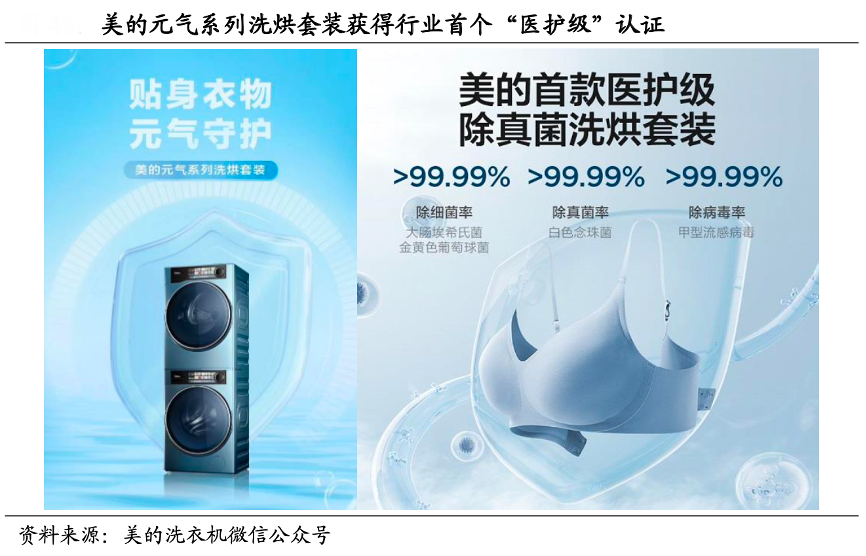 經(jīng)典案例:根據(jù)美的洗衣機(jī)微信公眾號、國海證券研究所等綜合資訊表明,消費(fèi)者對于家庭“洗干護(hù)”體系的要求越來越精致化、健康化,相繼催生快速烘干、除菌烘干、低溫護(hù)衣等技術(shù),例如美的集團(tuán) 2022 年 5 月發(fā)布的新品元?dú)庀春嫣籽b就承載了 80 余項(xiàng)發(fā)明專利,獲得中衛(wèi)安認(rèn)證中心“醫(yī)護(hù)級”認(rèn)證,能夠有效解決衣物混洗時(shí)的交叉感染問題。