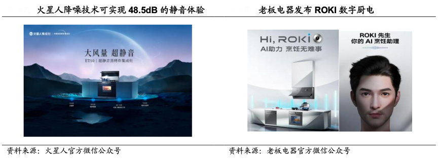 經(jīng)典案例:根據(jù)火星人官方微信公眾號、老板電器官方微信公眾號、國海證券研究所等綜合資訊表明,廚電新技術(shù)著力解決油煙和噪音問題,數(shù)字化驅(qū)動新一輪廚房革命。火星人新品 ET50 應(yīng)用大風(fēng)量降噪技術(shù),可實(shí)現(xiàn)48.5dB 的靜音體驗(yàn)。老板電器于2022 年 8 月發(fā)布了全新數(shù)字廚電產(chǎn)品線品牌 ROKI 及其第一代產(chǎn)品“創(chuàng)造者i1”,將廚房單品連點(diǎn)成網(wǎng),激發(fā)場景互動,還能根據(jù)用戶行為數(shù)據(jù)進(jìn)行自主學(xué)習(xí),向用戶提供烹飪幫助和生活陪伴。同時(shí),精進(jìn)區(qū)塊鏈等技術(shù)來保障用戶信息安全,有效緩解智能家居普及的一大后顧之憂。