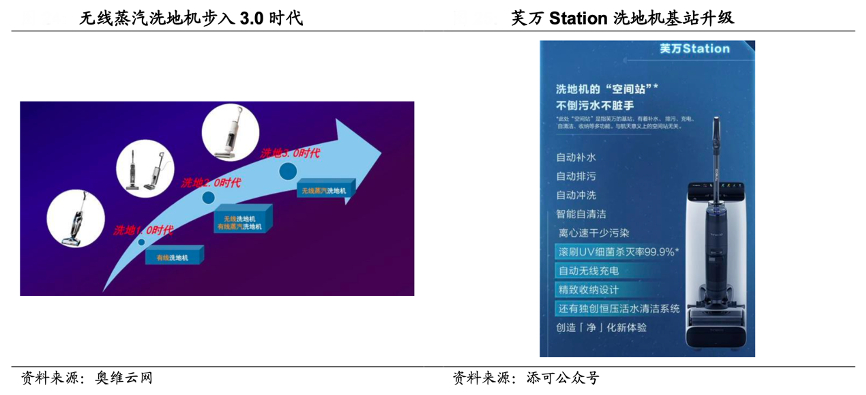 經典案例:根據奧維云網、添可公眾號、國海證券研究所等綜合資訊表明,無線蒸汽洗地機開啟行業 3.0 時代,基站自動化升級解決清洗痛點。1)無線蒸汽洗地機:2022 年 8 月安克創新子品牌悠飛馬赫推出無線蒸汽洗地機 V1 Ultra, 隨后追覓推出 T12,添可推出芙萬 Steam2.0,實現高溫清潔除菌,針對性解決 養寵一族、重度清潔愛者、精致寶媽等核心用戶需求,有望進一步打開市場。2) 基站升級:人工排污換水始終是洗地機產品的痛點,無法真正解放雙手。2022年 9 月發布芙萬 Station 洗地機“空間站”,實現自動補水、排污、沖洗、自清潔等新功能。