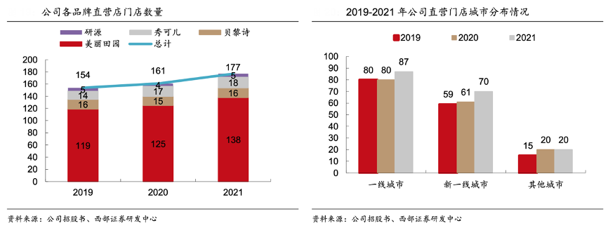 經典案例:根據公司招股書、西部證券研究中心等綜合資訊表明,美麗田園公司率先在人口眾多且消費水平較高的一線城市建立門店,且門店大多數位于黃金地段,是高客流量、高曝光率店鋪。根據招股書數據,截至 22 年6 月 30 日,公司在北京、上海、深圳三個一線城市擁有 84 家門店,在新一線城市擁有 73 家門店。同時設立美麗田園小程序,讓客戶線上預約,及時查看門店和產品服務信息,并參與線上營銷活動。