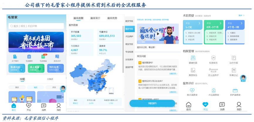 經典案例:根據毛管家微信小程序、華創證券等綜合資訊表明,雍禾公司致力于推動就醫服務標準化,在微信小程序推出毛管家小程序,除了提供科普服務、咨詢服務、預約服務、商品購買商城等,還構建了健康檔案管理和發友心得交流等平臺,基本搭建了從術前到術后的全流程數據管理體系。截至 2021 年 12 月,毛管家已擁有 81.1 萬名注冊用戶。