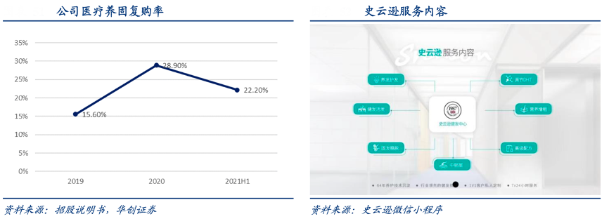 經典案例:根據招股說明書、史云遜微信小程序、華創證券等綜合資訊表明,雍禾對于暫時不需要植發的患者,通過提供醫療養固服務也可以完成到店轉化,且目前已有一定比例的客戶為植發前養護,養固與植發相互導流,形成閉環。當前公司醫療養固業務復購率介于 20-30%之間,2020年全年為 28.9%,21H1 為 22.2%,因大部分預付費套餐為 2 年內使用完畢,因此復購率會有一定波動。