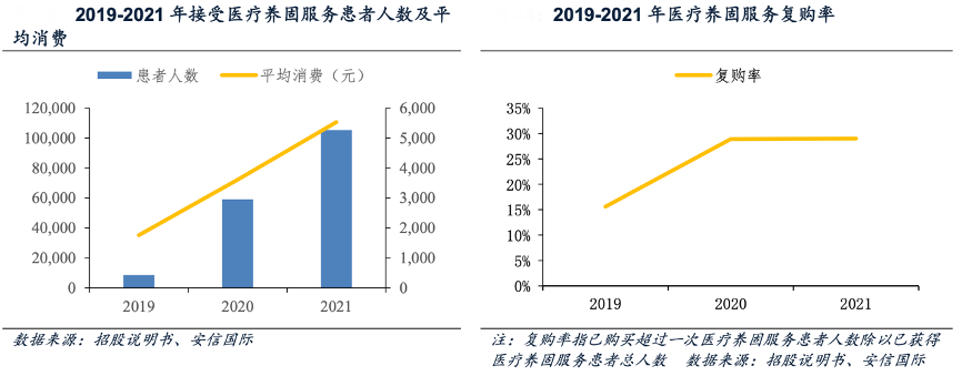 經典案例:根據招股說明書、安信國際等綜合資訊表明,雍禾醫療公司收購英國健發品牌史云遜后開始進軍醫療養固業務,經過多年的發展,協同效應成效顯現,2021 年植發患者手術后選擇進行醫療養固服務的轉化率為44.6%,醫療養固服務后繼續選擇植發手術的轉化率為4.1%。因醫療養固服務非手術且更易負擔,受到越來越多消費者的青睞,接受醫療養固服務的患者人數、人均消費、復購率不斷攀升,其中,復購率從 2019 年的 15.6%增長至 2021 年的 29.0%,說明消費者粘性不斷提高。