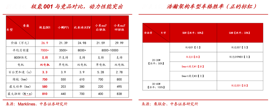經典案例:根據Marklines、乘聯會、中泰證券研究所等綜合資訊表明,極氪001為浩瀚架構的代表車型,動力性能為其主打賣點。對比來看,極氪 001 作為浩瀚架構的代表車型,其支持 800V 快充,在百米加速、功率等動力性能參數上皆有優勢。