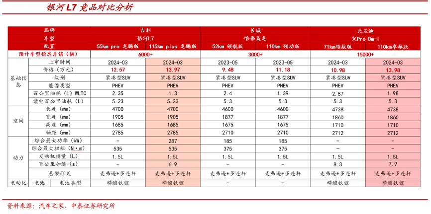 經典案例:根據汽車之家、中泰證券研究所等綜合資訊表明,在競品對比方面,銀河更為側重外觀的年輕化以及動力性能,以吸引城市年輕人為主。以銀河 L7 為例,高配車型在同類競品中動力性能 優勢突出。目前 L7 的競品主要為比亞迪宋 Pro,銀河在空間、油耗、零百 加速方面更具性價比。