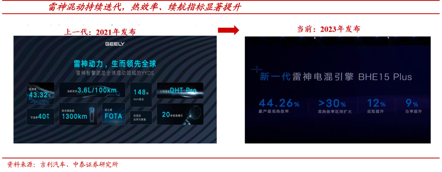 經典案例:根據吉利汽車、中泰證券研究所等綜合資訊表明,以銀河 L7 為例,其在搭載 1.5T 雷神電混 8848 系統并配備 P1+P2 雙電機,最低荷 電油耗為百公里 5.23L,CLTC 綜合續航則達到 1370km。