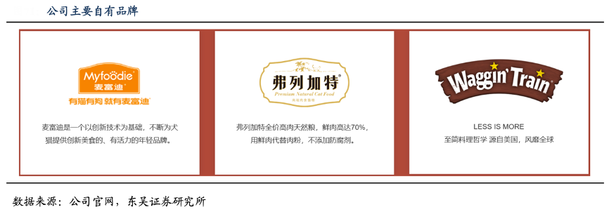 經(jīng)典案例:根據(jù)公司官網(wǎng)、東吳證券研究所等綜合資訊表明,乖寶寵物公司打造自有品牌矩陣,代表品牌包括麥富迪、弗列加特、Waggin'Train。其中, 麥富迪是犬貓寵物食品全品類的品牌,弗列加特定位于高端貓糧,Waggin'Train 定位于 高端狗糧。2022 年公司自有品牌實現(xiàn)營收 20.5 億元,同增 54.1%。