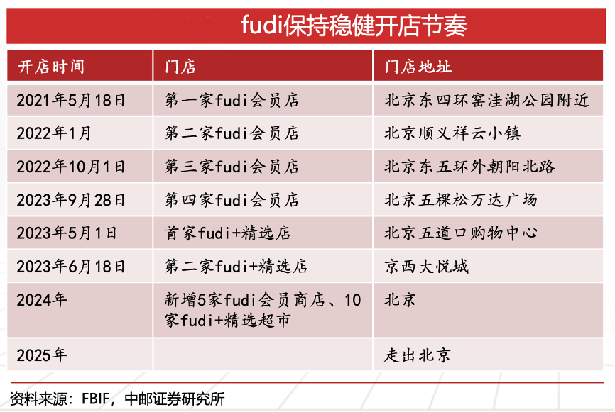 經典案例:根據FBIF、中郵證券研究所等綜合資訊表明,2021年,首家fudi會員店落地北京東四環窯洼湖公園,在不到3年時間中,fudi已在北京開設4家會員店、2家fudi+精選店,在京門店超山姆。截止2023年8月,fudi會員數已達18.8萬,增速喜人。