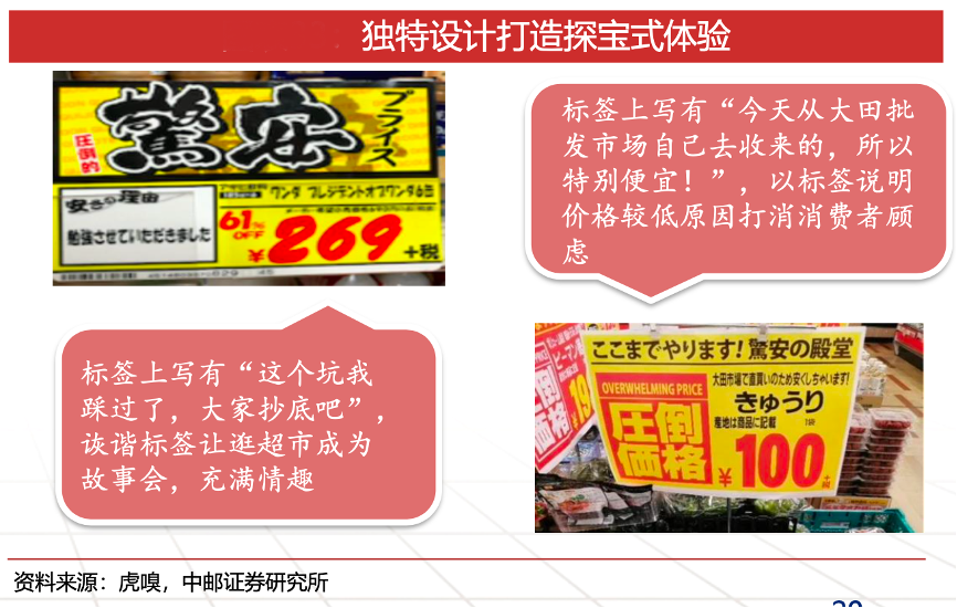 經典案例:根據虎嗅、中郵證券研究所等綜合資訊表明,唐吉訶德對于主推商品,每一家門店在價格標簽之外附上員工“心聲”,無形之中拉進消費者和員工的距離,變“銷售員”為“朋友”,化“推銷商品”為“推薦商品”。而詼諧幽默又一針見血的標簽即構成探寶本身,讓本身只是為了滿足剛需的剛需轉變為休閑娛樂的購物,用“探寶式體驗”增加顧客購物頻次、打消顧客對于低價商品顧慮,一箭雙雕。