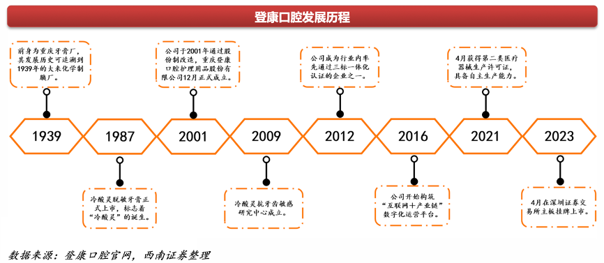 經典案例:根據登康口腔官網、西南證券等綜合資訊表明,登康口腔前身為重慶牙膏廠,其發展歷史可追溯到1939年的大來化學制胰廠。2009年,公司成立冷酸靈抗牙齒敏感研究中心。2016年,公司開始構筑“互聯網+產業鏈”數字 化運營平臺。2023年,公司在深圳證券交易所主板掛牌上 市。