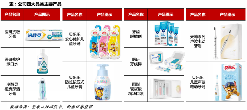 經典案例:根據登康口腔招股書、西南證券等綜合資訊表明,重慶登康口腔護理用品股份有限公司主要從事口腔護理用品的研發、生產與銷售,主要產品涵蓋成人基礎口腔護理產品、兒童基礎口腔護理產 品、口腔醫療與美容護理產品以及電動口腔護理產品四大類。公司旗下擁有“登康”“冷酸靈”等知名口 腔護理品牌,以及高端專業口腔護理品牌“醫研”、兒童口腔護理品牌“貝樂樂”、高端嬰童口腔護理品 牌“萌芽”,為各年齡段消費人群提供專業化、個性化的高品質口腔護理用品。
