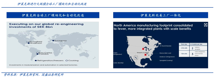 經典案例:根據伊萊克斯官網、國盛證券研究所等綜合資訊表明,2023年伊萊克斯總額為 80 億瑞典克朗的全球工廠改造計劃已經接近尾聲,在北美、南美和歐洲的冰洗以及廚電重點工廠提升模塊化和自動化效率,將部分基地整合,實現規模經濟效益,既有助于降低運營成本,又能提升供應鏈的靈活性和反應速度。