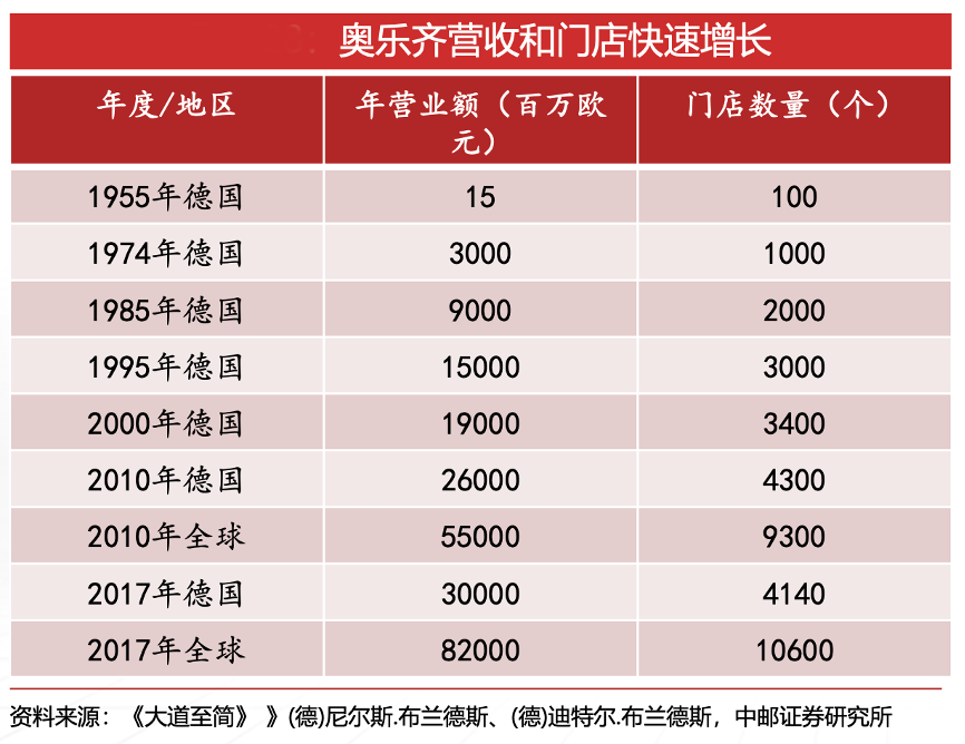 經典案例:根據《大道至簡》、中郵證券研究所等綜合資訊表明,簡單的經營理念搭配高效的管理措施,輔之以德國對產品精益求精的一貫嚴格,助力奧樂齊年營業額不斷增加,全球總門店數已破萬。2017年奧樂齊全球門店突破10000家,穩坐德國零售超市龍頭,在全球折扣零 售店中名列前茅,成為廣大零售品牌值得借鑒的對象。