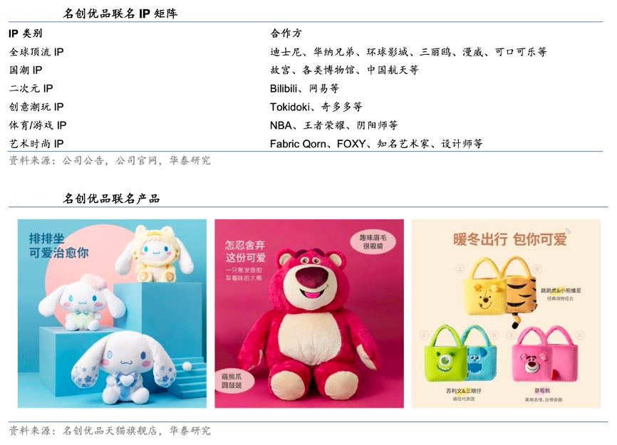 經典案例:根據公司公告、公司官網、名創優品天貓旗艦店、華泰研究等綜合資訊表明, 2016 年以來名創優品陸續和粉紅 豹、Hello Kitty、芝麻街、Universal、迪士尼、故宮、NBA、漫威、中國航天、陰陽師、Bilibili 等知名 IP 推出聯名產品,截至 2023 年 6 月 30 日,名創優品已與 82 個 IP 進行聯名合作。