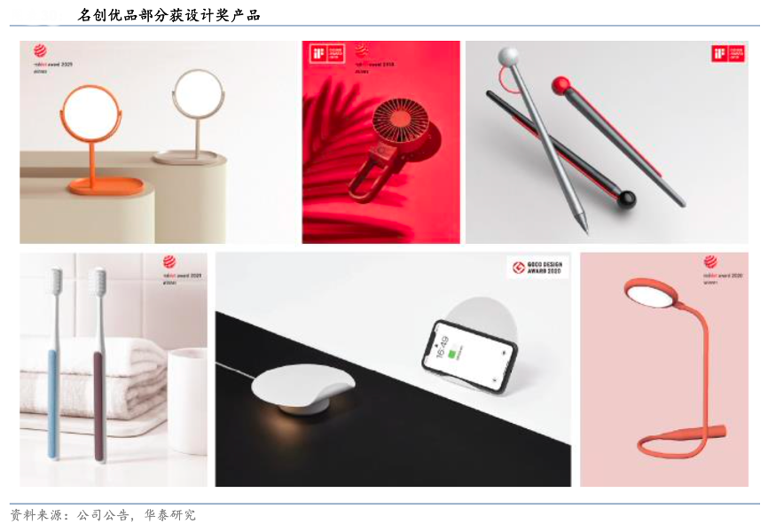 經典案例:根據公司公告、華泰研究等綜合資訊表明,名創優品“內部設計師+外部合作”結合,實現產品差異化。截至 2021 年底,公司擁有 124 名設計 師組成的內部團隊,并與 37 名設計師(獨立設計師、工作室設計師及名創內部精選設計師) 合作,打造形成名創獨有的設計師網絡資源,產品設計屢獲國家知名獎項。