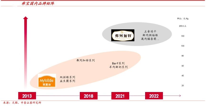 經(jīng)典案例:根據(jù)天貓、中泰證券研究所等綜合資訊表明,乖寶寵物公司2021年進(jìn)階高端市場,完善品牌矩陣,提升品牌調(diào)性。2021年公司推出子品牌弗列加特(高端貓糧),收購雀巢普瑞納旗下美國品牌 Waggin’Train(高端犬糧),代理 K9 進(jìn)軍高端寵食市場。