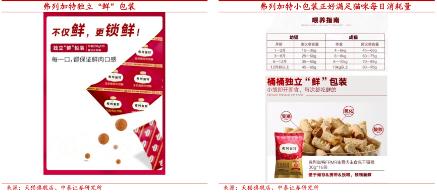 經(jīng)典案例:根據(jù)天貓旗艦店、中泰證券研究所等綜合資訊表明,乖寶寵物通過對貓咪和消費(fèi)者的細(xì)致觀察,發(fā)現(xiàn)首先貓的食量相對較小,其次,貓對食物相對挑剔,因此養(yǎng)貓人在買貓糧的時(shí)候,相對謹(jǐn)慎。因此給予兩大痛點(diǎn),公司采用小規(guī)格形式對弗列加特系列產(chǎn)品進(jìn)行包裝。這樣能保證貓咪每次吃到的食物可以充分鎖鮮,不回潮。其次,消費(fèi)者可以只買一小袋試吃裝進(jìn)行嘗試,提高了用戶首次購買的破冰概率。