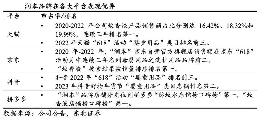 經(jīng)典案例:根據(jù)公司官網(wǎng)、東北證券等綜合資訊表明,潤本股份公司目前旗下僅有“潤本”品牌,“潤”寓意 潤澤和呵護(hù),“本”寓意本源和人生本初,品牌在嬰童護(hù)理和精油產(chǎn)品系列均強(qiáng)調(diào)天然草本植物提取液,塑造安全、溫和以及天然的品牌形象,深度貼合消費(fèi)者對嬰童用品和個(gè)護(hù)產(chǎn)品的訴求。