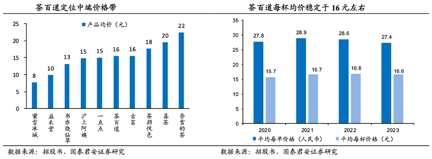 經典案例:根據招股書、國泰君安證券研究等綜合資訊表明,茶百道定位中端價格帶,性價比優(yōu)勢顯著。茶百道每杯均價穩(wěn)定在 16 元左右, 原材料環(huán)節(jié)嚴格把控,多為原葉和鮮果,產品力穩(wěn)定。