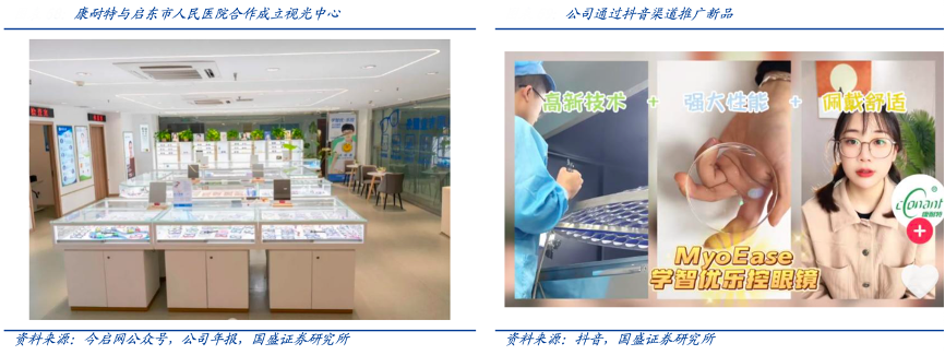 經(jīng)典案例:根據(jù)今啟網(wǎng)公眾號(hào)、公司年報(bào)、抖音、國(guó)盛證券研究所等綜合資訊表明,耐特光學(xué)公司通過(guò)與醫(yī)院合作成立視光中心,借助醫(yī)院專(zhuān)業(yè)化渠道背書(shū),宣傳視力保護(hù)防控知識(shí),推薦護(hù)目矯視眼鏡,直接接觸終端客戶(hù)。同時(shí)公司布局抖音等新興電商渠道,通過(guò)專(zhuān)業(yè)科普方式提升品牌力。