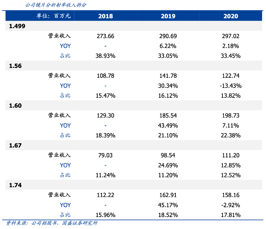 經(jīng)典案例:根據(jù)公司招股書、國盛證券研究所等綜合資訊表明,耐特光學(xué)高折射率鏡片占比穩(wěn)步提升,高端化趨勢明確。公司鏡片覆蓋 1.499-1.74 折射率范圍,2020年 1.499/1.56/1.60/1.67/1.74 折射率鏡片收入占比分別為 33.5%/13.8%/22.4%/12.5%/17.8% , 2018-2020 年 CAGR 分 別 為 4.2%/6.2%/24.0%/18.6%/18.7%,高折射率鏡片增速快于整體。