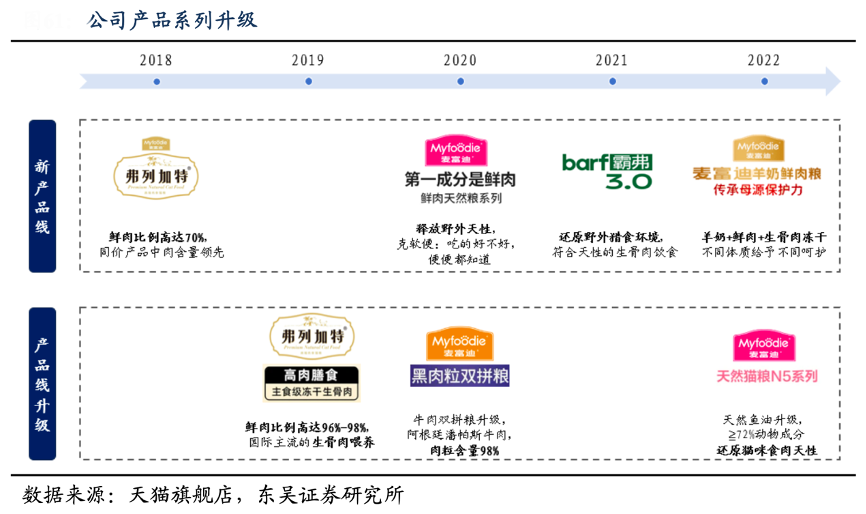 經(jīng)典案例:根據(jù)招股說(shuō)明書(shū)、煉丹爐數(shù)據(jù)、、東吳證券研究所等綜合資訊表明,乖寶寵物隨著成分配方優(yōu)化和新產(chǎn)品線(xiàn)的推出均價(jià)趨于提升,產(chǎn)品均價(jià)趨于提升,2020-2022 年,公司主糧/零食/保健品及其他的 均價(jià)分別提升了 37%/22%/52%。其中,麥富迪的高端系列“Barf 系列”和高端貓糧“弗 列加特系列”均表現(xiàn)突出。