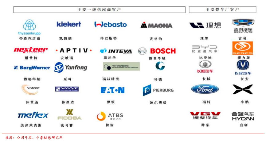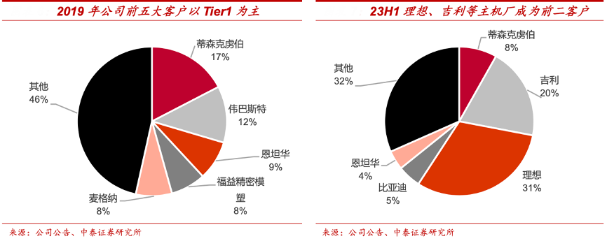 經典案例:根據公司公告、中泰證券研究所等綜合資訊表明,博俊科技公司重慶工廠擁有眾多整車廠客戶:長安、吉利、理想、賽力斯等,自 2021 年重慶工廠投產后,相關客戶配套車型陸續投入量產,客戶結構發生顯著變化,2019 年公司前五大客戶都是 Tier1,2023 年上半年理想、吉利收入占比 分別達到 31%、20%,成為前二大客戶。