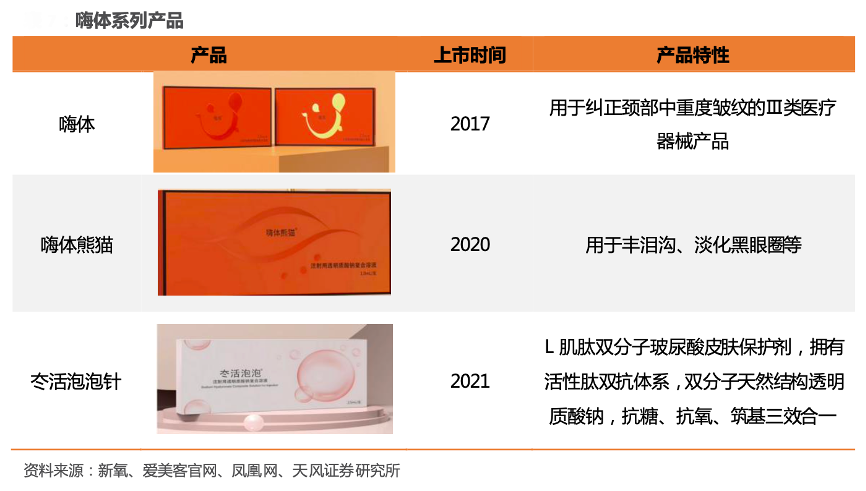 經(jīng)典案例:根據(jù)新氧、愛(ài)美客官網(wǎng)、鳳凰網(wǎng)、天風(fēng)證券研究所等綜合資訊表明,愛(ài)美客嗨體系列立足市場(chǎng)空缺( 頸紋)或 稀缺性( 眼周 /合規(guī) 水光)領(lǐng) 域,差異化推新相繼上市嗨體、嗨體熊貓、冭活泡泡針產(chǎn)品,該系列產(chǎn)品主要由透明質(zhì)酸鈉、L-肌肽、甘氨酸、丙氨酸、脯氨酸、維生素 B2 和注射用水組成,多組分在滋養(yǎng)的同時(shí)可通過(guò)提升成纖維細(xì) 胞膠原分泌能力達(dá)成祛皺緊致等功效。