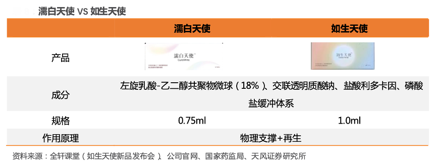 經(jīng)典案例:根據(jù)全軒課堂(如生天使新品發(fā)布會(huì))、公司官網(wǎng)、國(guó)家藥監(jiān)局、天風(fēng)證券研究所等綜合資訊表明,愛(ài)美客公司于 2021 年推出濡白天使, 與伊妍仕、艾維嵐兩款產(chǎn)品一同拉開(kāi)國(guó)內(nèi)再生序幕,23 年 7 月再推如生天使,與濡白天使 共同開(kāi)啟再生系列化篇章。