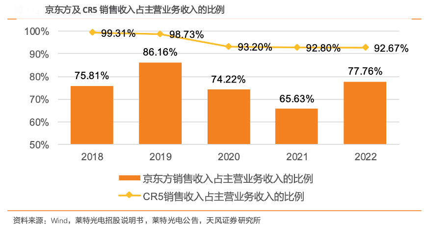經典案例:根據wind、萊特光電招股說明書、萊特光電公告、天風證券研究所等綜合資訊表明,自 2018 年至 2022 年,京東方得益于其在 OLED 小尺寸顯示面板領域所擁有的全球第二、國內領先的顯著市場優勢,始終占據公司核心客戶的地位。同時,公司前五大客戶(CR5)的銷售占比雖然自 2018 年以來呈現出逐年遞減的趨勢,表明公司正在積極拓展新客戶基礎,但至 2022 年,這一 集中度依然高達 92.67%,反映了公司客戶結構相對集中的現狀。