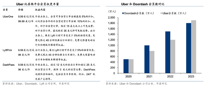 經(jīng)典案例:根據(jù)Uber、Doordash、Lyft公司官網(wǎng)、Uber和Doordash公司公告、華泰研究等綜合資訊表明,Uber以會員制進行業(yè)務(wù)間的深度綁定,在同樣的價格下權(quán)益內(nèi)容比其他單一平臺更為豐富,通過提供包括網(wǎng)約車和外賣在內(nèi)的多項服務(wù)優(yōu)惠,根據(jù) Uber2023 投資者日,Uber 會員 用戶的消費是非會員用戶的 3.4 倍。根據(jù)公司 2Q24 業(yè)績會,橫向?qū)Ρ葋砜矗琔ber 的會員制度發(fā)展迅速,2023 年會員數(shù)增速(58%)顯著高于競對 Doordash(20%)。