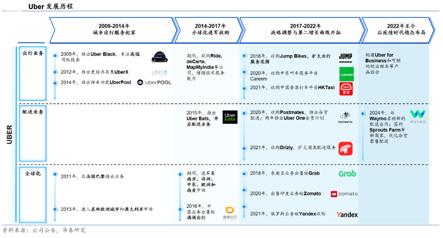 經(jīng)典案例:根據(jù)公司公告、華泰研究等綜合資訊表明,Uber出行服務(wù)起家,縱橫拓展成為全球領(lǐng)先的移動科技平臺。