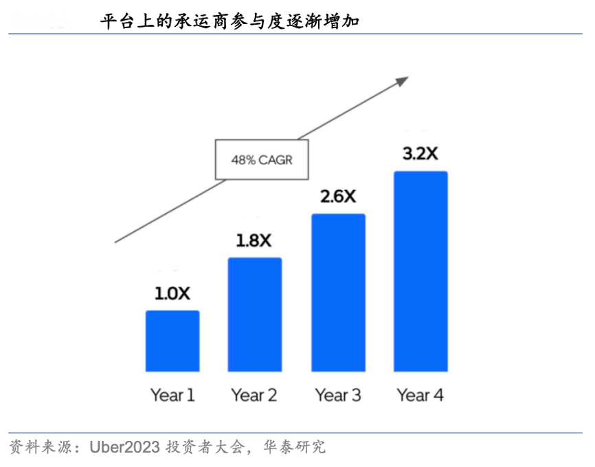 經典案例:根據Uber投資者大會、華泰研究等綜合資訊表明,Uber Freight 注重維系承運商忠誠度,通過提供透明的計費系統、及時的結算服務以及各類獎勵計劃等措施提升參與度,承運商參與度逐年增加,CAGR 達到 48%。盡管面臨 C.H. Robinson、 DAT Solutions 等競爭對手,Uber Freight 仍憑借其技術優勢和平臺特性,成為眾多承運商 的首選合作伙伴。