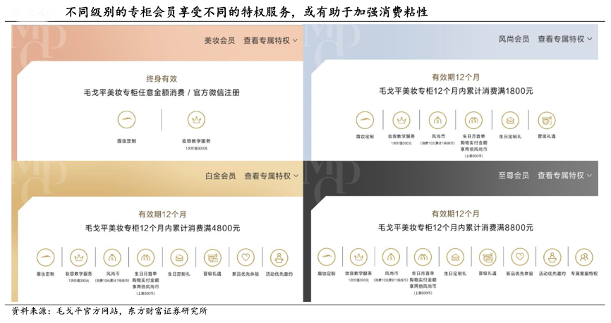 經(jīng)典案例:根據(jù)毛戈平官方網(wǎng)站、東方財(cái)富證券研究所等綜合資訊表明,毛戈平品牌建立了成熟的專(zhuān)柜會(huì)員體系,全國(guó)專(zhuān)柜配備了超 2700 名精通化妝知識(shí)和技能的美妝顧問(wèn),平均每個(gè)專(zhuān)柜配備 7-8 個(gè)顧問(wèn),能夠?yàn)闀?huì)員提供眉妝定制以及妝容教學(xué)服務(wù)(美妝會(huì) 員 1 次,風(fēng)尚會(huì)員 8 次,白金會(huì)員 12 次,至尊會(huì)員 24 次;單次價(jià)值 300 元)。