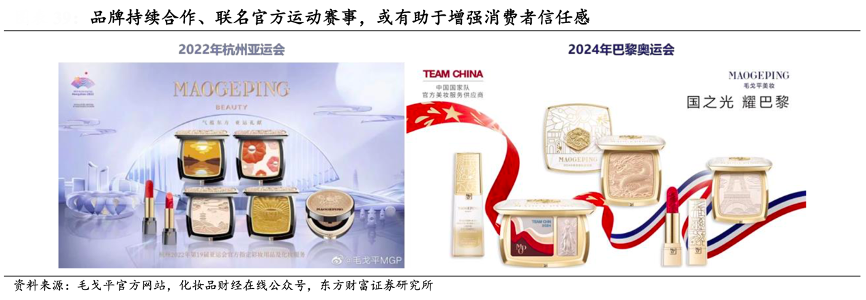 經典案例:根據毛戈平官方網站、化妝品財經在線公眾號、東方財富證券研究所等綜合資訊表明,基于創始人在彩妝行業的高知名度和認可度,于 2008/2009 年,毛戈平品牌分別擔任北京奧運會開幕式/ 中華人民共和國成立 60 周年國慶閱兵式化妝師,21 年開始進一步合作杭州亞運會、擔任中國國家隊官方合作伙伴,并先后推出了“TEAM CHINA”聯名的 杭州亞運會、巴黎奧運會主題系列產品。