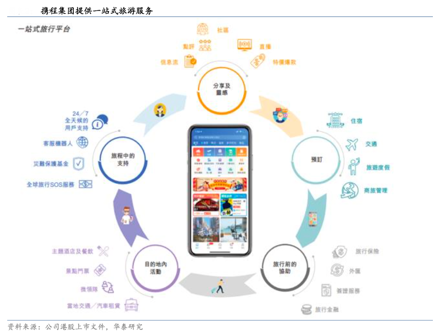 經典案例:根據公司官網、公司公告、華泰研究等綜合資訊表明,攜程集團(Trip.com Group)成立于 1999 年,其主要業務包括住宿預定、交通票務、旅游度假以及商旅管理,2003 年在納斯達克上市并于 2021 年 在香港聯交所上市,是全球領先的一站式 OTA 平臺。