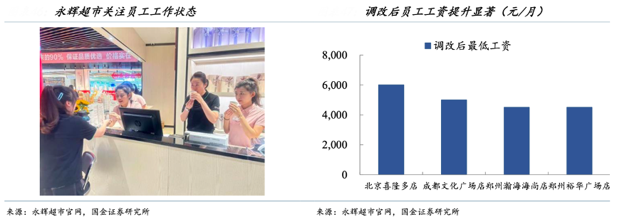 經典案例:根據永輝超市官網、國金證券研究所等綜合資訊表明,為了保證終端門店能提供一致性的購物體驗,永輝超市大力提高了員工待遇,從而激發員工積極性。在具體舉措中,最直接的激勵就是提升薪資待遇,調改門店員工平均工資漲幅在 20%左 右。最低工資門檻的提升幅度則更為顯著,例如鄭州瀚海海尚店員工最低工資來到 5000 元/月,漲幅超過 60%。