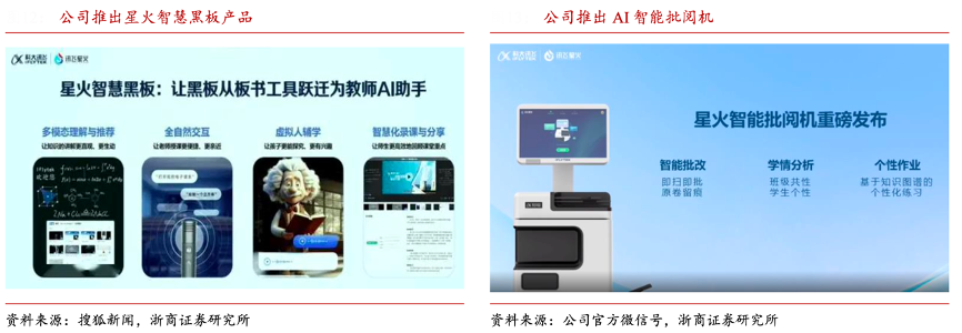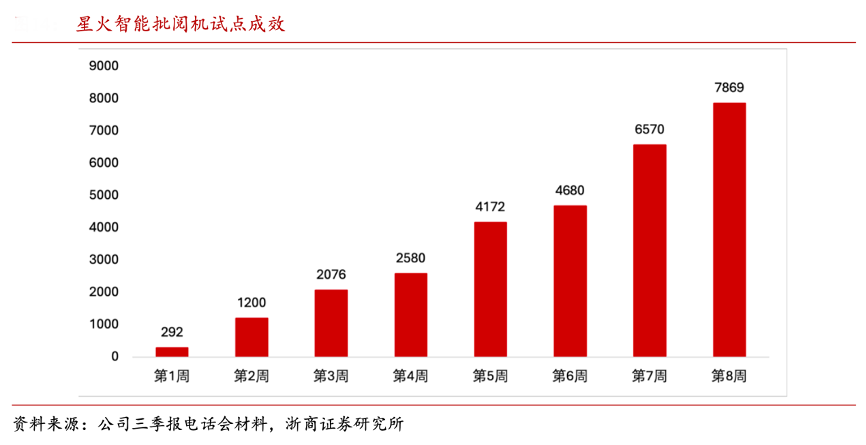 經典案例:根據公司三季報電話會材料、浙商證券研究所等綜合資訊表明,2024年暑期星火智能批閱機在上海、浙江、江蘇、天津、安徽等省市啟動試點,覆蓋近百所試點應用校的初高中 11 個 年級學科。試點數據顯示,星火智能批閱機的校周作業批改量從第一周的 292 份快速增長 至第 8 周的 7869 份,平均批改準確率達到 99.5%,產品用戶價值得到不斷驗證。