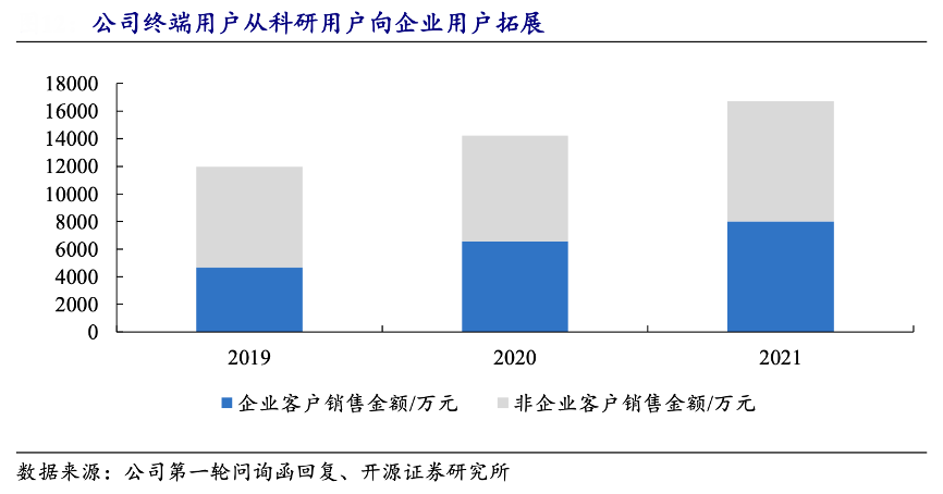 經典案例:根據公司第一輪問詢函回復、開源證券研究所等綜合資訊表明,新芝生物公司積極鞏固科研用戶,并將客戶群體向企業用戶拓展。自 2019 年至 2021 年,公司終端用戶為企業用戶的銷售占比自 39.08%增長至 47.91%,銷售金額自 2019 年 的 4,674.11 萬元增長至 2021 年的 8,006.90 萬元,復合年均增長率達 30.88%。