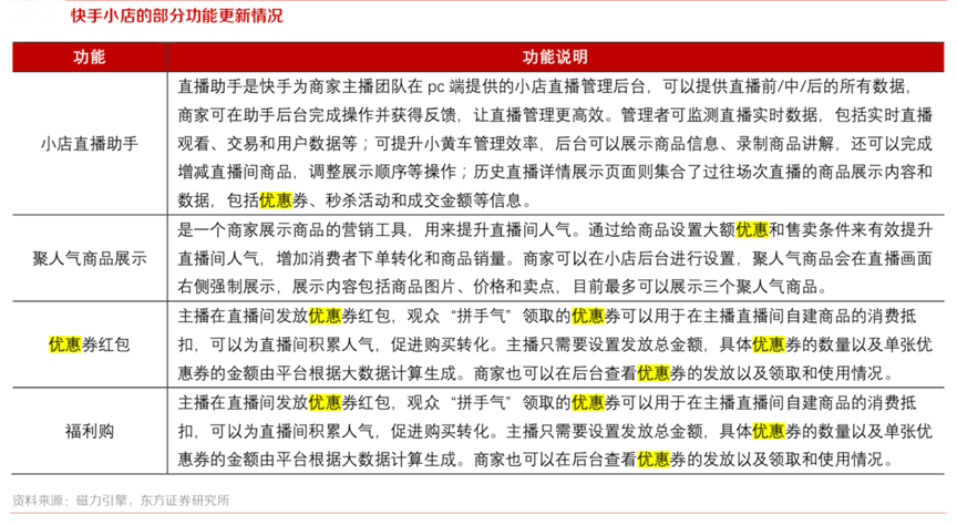經典案例:根據磁力引擎、東方證券研究所等綜合資訊表明,快手小店 2020 年以來,迎來了密集的功能完善,新增了很多數據回傳和管理工具、流量獲取工具、商品管理和上架工具等。