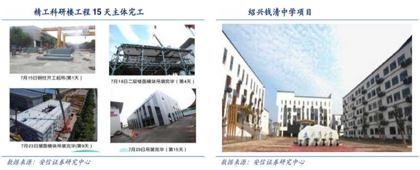 經(jīng)典案例:根據(jù)安信證券研究中心等綜合資訊表明,“精工科研樓”是精工鋼構(gòu)的樣板項(xiàng)目,此科研樓為 3 層建筑,面積 3500 平方米,僅耗時 15 日完成主體工程, 實(shí)現(xiàn) 30 日竣工,工程裝配率達(dá)到 90%以上,產(chǎn)品集成率達(dá)到 85%以上。
