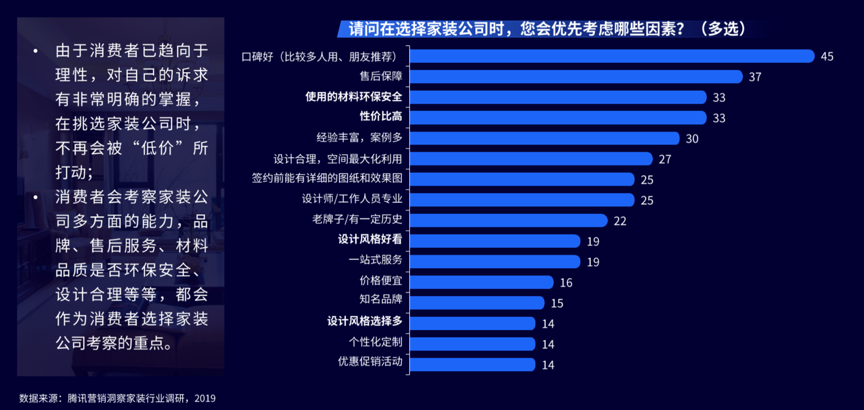 家裝消費有其固有的流程,“家裝公司選擇”是無法回避的一環,也是極關鍵的一環,其往往成為全屋家裝新零售電商品牌策劃營銷的第一步。根據《2019年騰訊營銷洞察家裝行業調研》等綜合資訊表明,服務口碑、售后保障和材料環保案例等是消費者選擇家裝公司的優先考慮要素,這些正是家裝企業品牌策劃營銷的關鍵之處,也是其打造行業領先品牌的發力點。