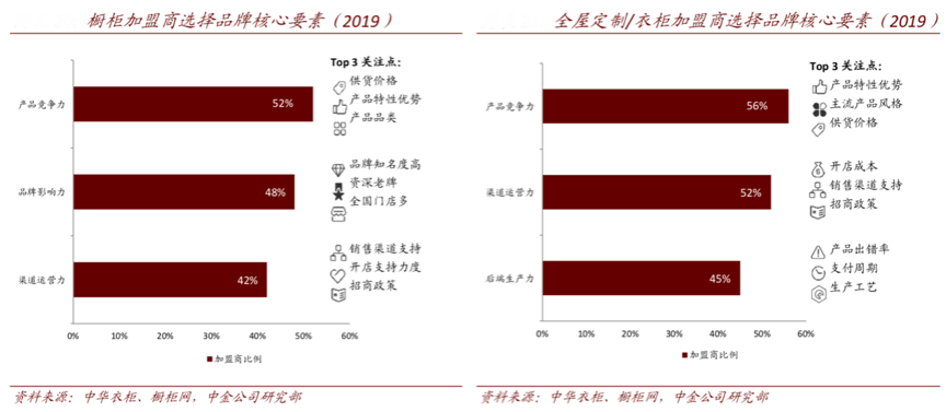 縱觀國內創新型渠道管理,無論是櫥柜還是全屋定制類的經銷商,其大多關注產品競爭力,在產品維度內,更關心供貨價、性價比、品類、風格等家裝要素,在當下,基于經銷商優惠的拿貨折扣、開發更具性價比的新款產品成為吸引經銷商的最主要因素。優秀的家裝新零售電商品牌,總有自己的品牌價值訴求、產品特色、主推的明星產品等,根據中華衣柜、櫥柜網和中金公司研究部等綜合資訊表明,櫥柜加盟商選擇品牌的核心要素在于產品競爭力(占52%)、品牌影響力(占48%)等,而全屋定制/衣柜加盟商選擇品牌的核心要素集中在產品競爭力(占56%)、渠道運營力(占52%),各加盟商對于產品、品牌和渠道等是重點關注的。