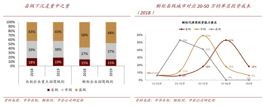 下沉市場極具商業價值,更是數字品牌營銷策劃創新的“大天地”,從中華衣柜、櫥柜網、中金公司研究部等綜合資訊表明,2019年櫥柜、衣柜/全屋定制縣級城市招商占比在43%和48%,未來縣級城市的下沉仍然是重中之重,以櫥柜 為例,縣級城市對應單店20-50萬元的投資額,較早布局的品牌有望在當地獲得較優質的經銷商資源,實現優勢卡位。