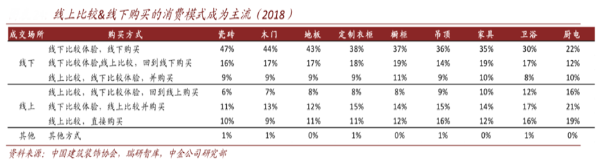 “家裝全渠道銷售場景構建”已經成為家裝行業的主流態勢,專注家裝服務的強體驗性及強服務感、亮化家裝服務的口碑——你也可以做得很好!從中國建筑裝飾協會、瑞研智庫和中金公司研究部等綜合資訊表明,線上比較&線下購買的消費模式已經成為行業主流,產品的線上口碑尤為關鍵,平均來看60%以上的消費者會在線上比較之后再購買商品;線下的實際服務與體驗是能否成交的核心要素,尤其是對于耐用品屬性更強的品類,比如瓷磚、木門、地板、衣柜、櫥柜等,線下成交的占比都接近70%。